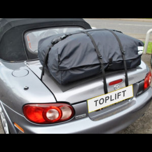 Removable waterproof boot bag for Mazda MX-5 Miatas. Attaches to the boot lid, using an unique strapping system. It sits on the boot on a non slip mat, to protect your paintwork.