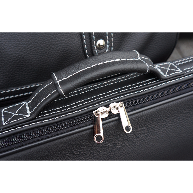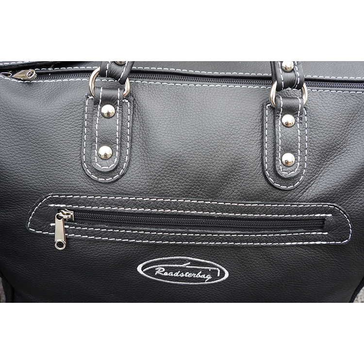 Väskorna är tillverkade i äkta italienskt svart läder, och har kontrasterande sömmar i silverfärgad tråd eller i mockafärg – du väljer här nedan. En del av bilderna visar en specialtillverkad röd modell, dessa är tillgängliga som specialorder till ett högre pris, se nedan för mer information. Innerfordret är tillverkat av Ancarra Microfiber (du väljer färg nedan). Väskorna kommer fint dekorerade med broderad logotyp (som du kan välja bort för en renare design, eller ersätta med en egen logga) och är tillverkade för hand i Europa.